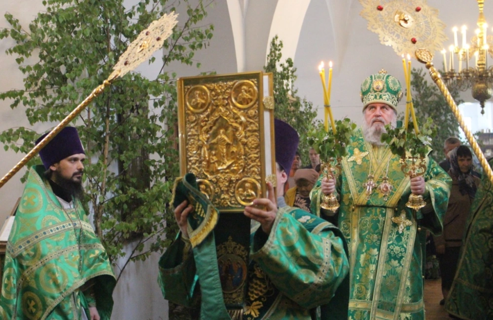У стен собора владыку Сергия встретил настоятель собора иерей Александр Курмелёв, поздравив владыку с Днём Пятидесятницы.