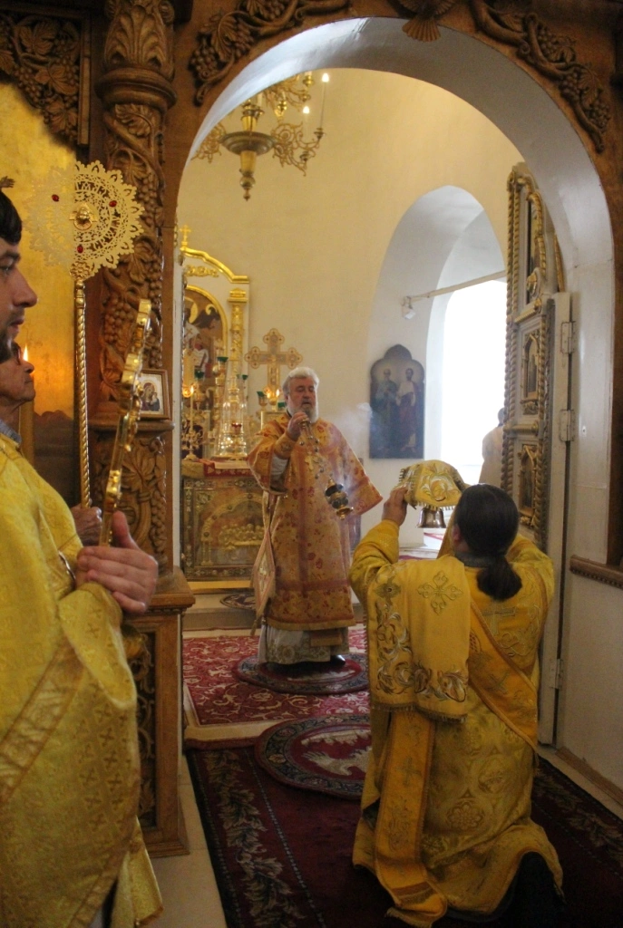 Правящему архиерею сослужили:Свято-Троицкого кафедрального собора г. Вязьмы иерей Александр Курмелёв иеромонах Симеон Березкин и иерей Максим Мамонов.Богослужебные песнопения исполнил архиерейский хор Свято-Троицкого кафедрального собора (регент —Елена Платонова).Диаконский чин возглавил клирик Свято-Троицкого кафедрального собора г. Вязьмы диакон Евгений Ткач .После сугубой ектиньи преосвященнейший владыка вознес молитву о мире.В завершении было совершено славление перед иконой Свяиых Царственных Страстотерпцев.По окончании Божественной литургии, владыка Сергий обратился к присутствующим с Архипастырским словом, после чего призвал на всех Божие благословение.