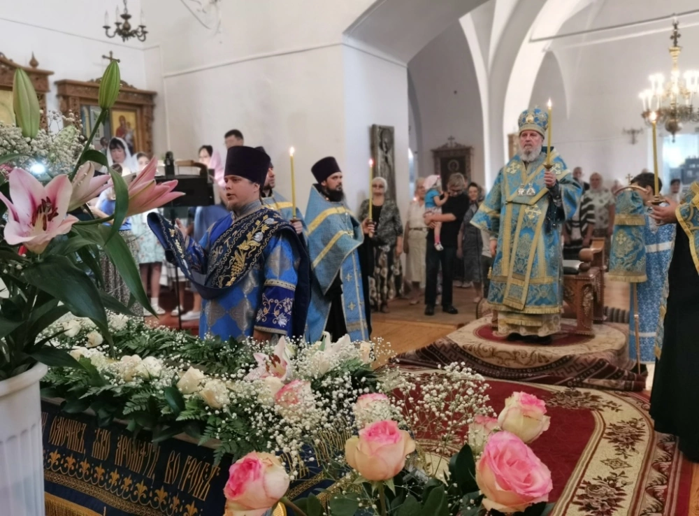 Во время пения полиелея из алтаря благоговейно была изнесена и размещена в центре храма плащаница Пресвятой Богородицы.