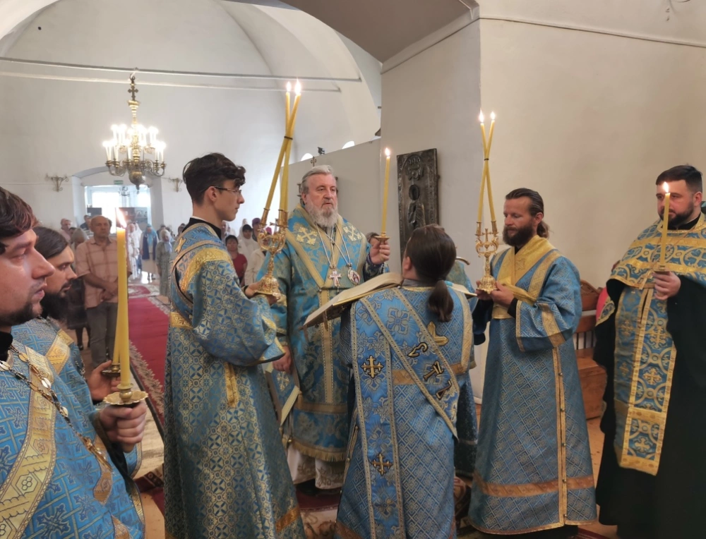 После великого славословия Епископ Сергий возглавил крестный ход с плащаницей с изображением Успения Пресвятой Богородицы.