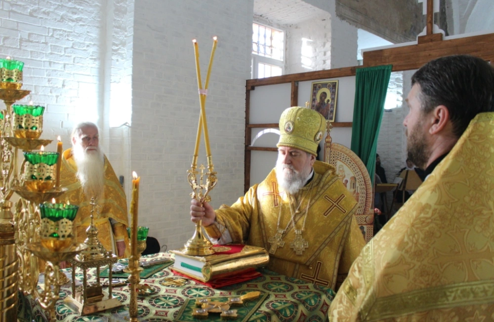 После Великого освящения храма, епископ Вяземский и Гагаринский Сергий совершил Божественную литургию свт. Иоанна Златоустого. За богослужением после сугубой ектиньи владыка Сергий вознес молитву о мире.