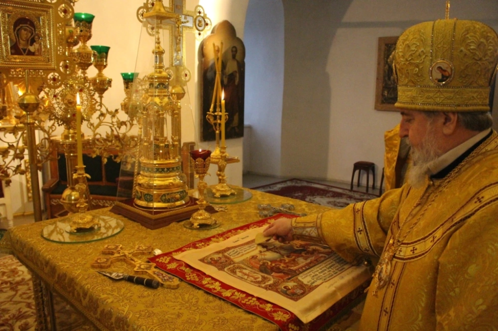 За Богослужением, после сугубой ектинии, владыка Сергий вознес молитву о мире.