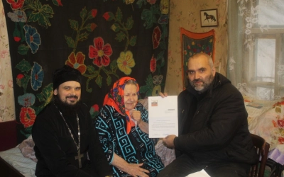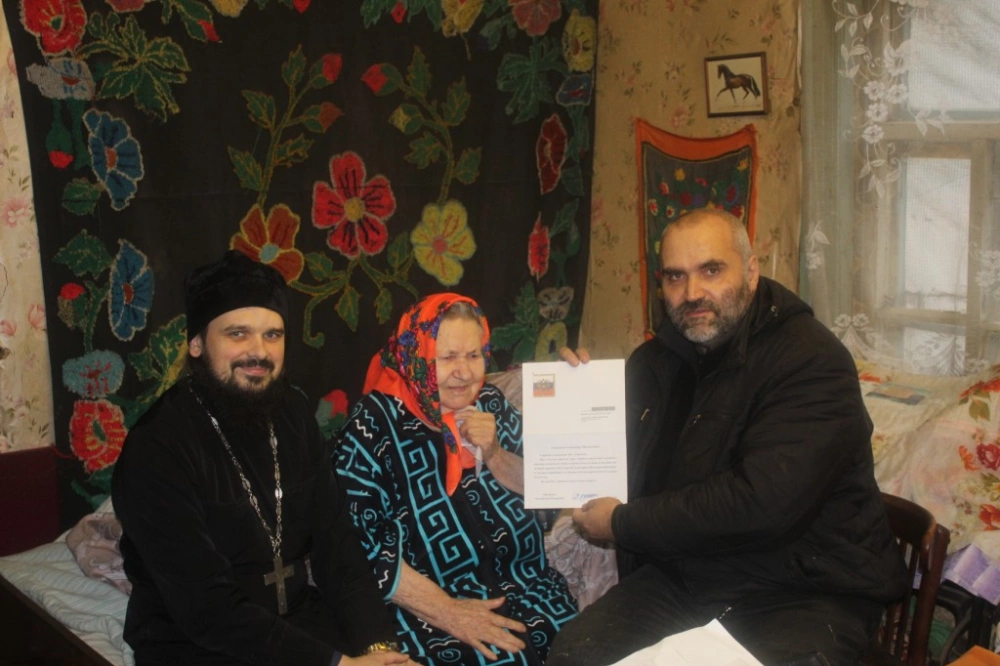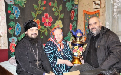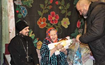 Как и положено, в гости к Александре Михайловне, Батюшка и администрация прибыли с подарками и поздравлениями. Владимир Владимирович Григорьев, вручил и зачитал поздравительное письмо от Президента Российской Федерации В.В.Путина, передал сувенир и поздравительный адрес от главы Администрации Вяземского района И.В. Демидовой, медаль и поздравления от Совета ветеранов, в лице А.Г. Тыщенко, теплое одеяло от Отдела социальной защиты населения в Вяземском районе, электросамовар от Администрации Новосельского сельского поселения.