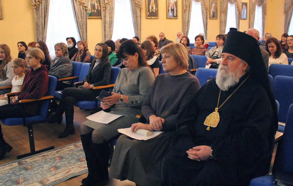 В зале собрались священнослужители Вяземской епархии, педагоги районных методических объединений, учащиеся - победители ежегодного епархиального конкурса "Красота Божьего мира" и их родители, педагоги победители регионального этапа Всероссийского конкурса в области педагогики, работы с детьми и молодежью до 20 лет «За нравственный подвиг учителя».