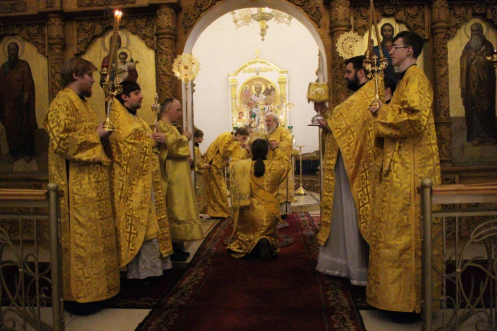 Его Преосвященству сослужили клирики собора иеромонах Симеон (Берёзкин) и иерей Максим Мамонов.
