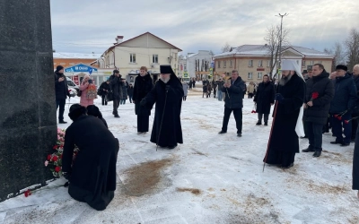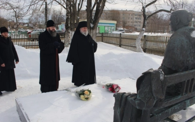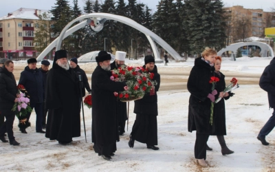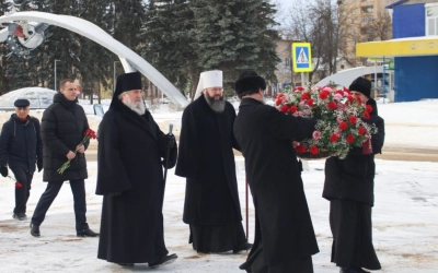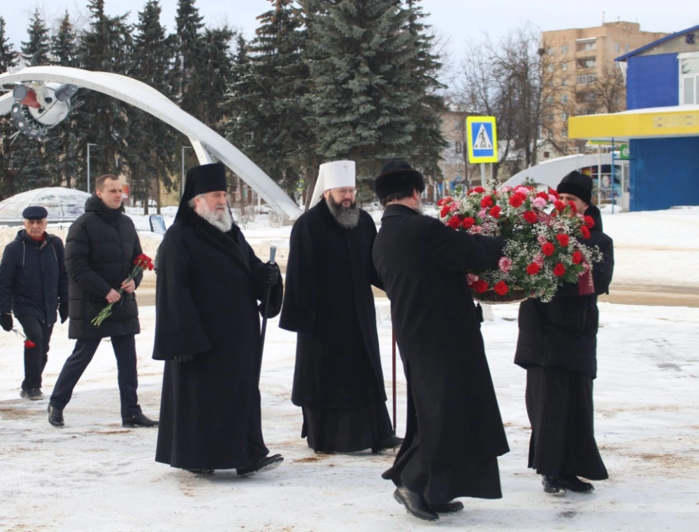 Во дворе Мемориального Дома-музея Гагарина Владыка Исидор и Владыка Сергий возложили цветы к памятнику Матери Первого космонавта планеты – Анне Тимофеевне Гагариной.