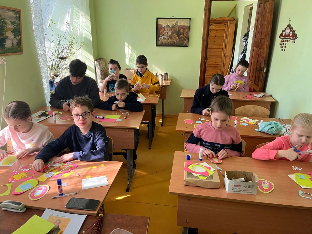 С благословения епископа Вяземского и Гагаринского Сергия, воспитанники детской воскресной приходской группы Архиерейского подворья Благовещенского собора города Гагарин изготовили открытки, разработанные преподавателями ( наборы для вырезания и изготовления Пасхальных открыток , доступные для скачивания и проведения благотворительных Пасхальных Акций) для наших ребят в зону боевых действий. Дети поздравили солдат с праздником и пожелали окончания военной операции. Также мальчики и девочки изготовили пасхальную композицию из веточек липы с маленькими птичьими гнёздами. Ветки липы уже удивили очевидцев зелёными листьями.