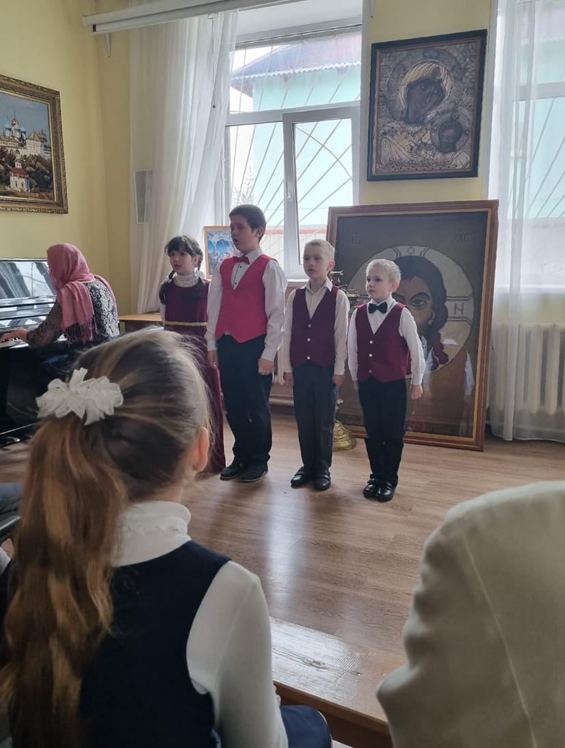 Зрителей поздравили младший хор воскресной школы, юношеский хор и ансамбль народной музыки под управлением Нафеевой А. А.