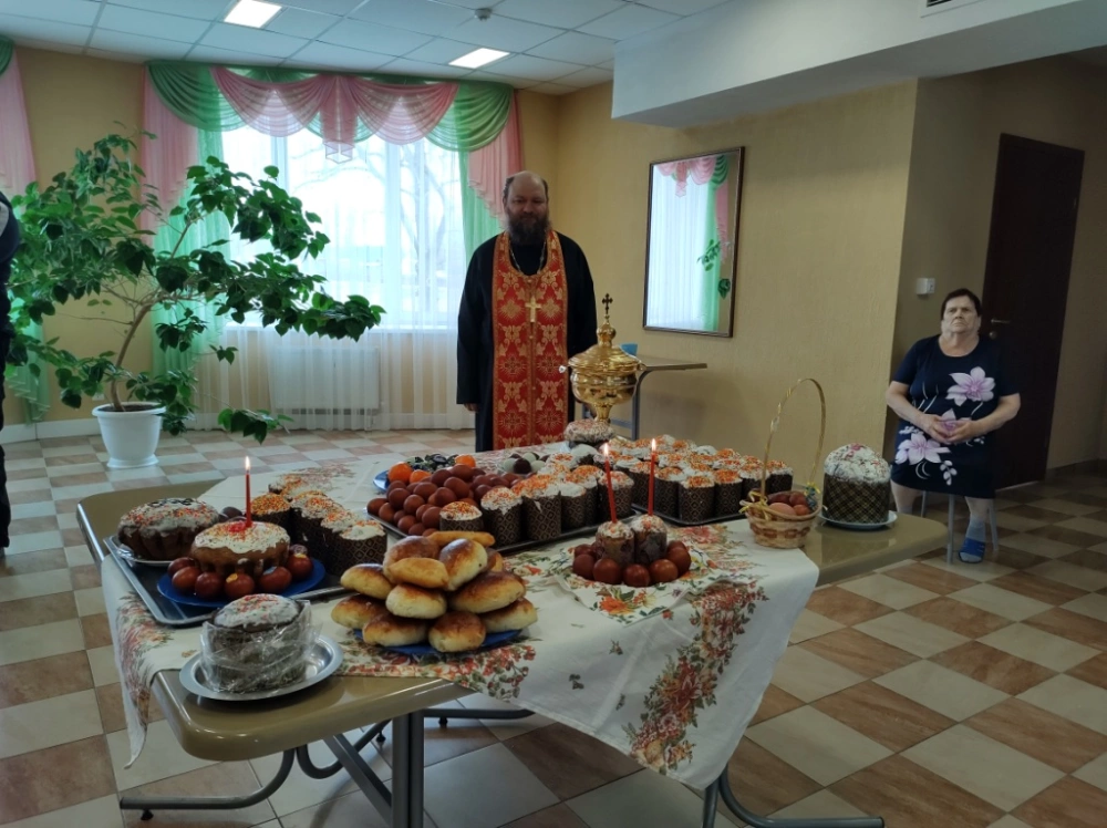 В обоих учреждениях состоялись встречи, в ходе которых о.Иоаннпоздравил проживающих и сотрудников со Святой Пасхой, рассказал о традиции освящения Пасхального хлеба – Артоса, куличей, творожных пасох,яиц, о чуде Марии Магдалины, освятил праздничную снедь, приготовленную к Светлому Воскресению, окропил Святой водой каждого участвовавшего в молебствии.