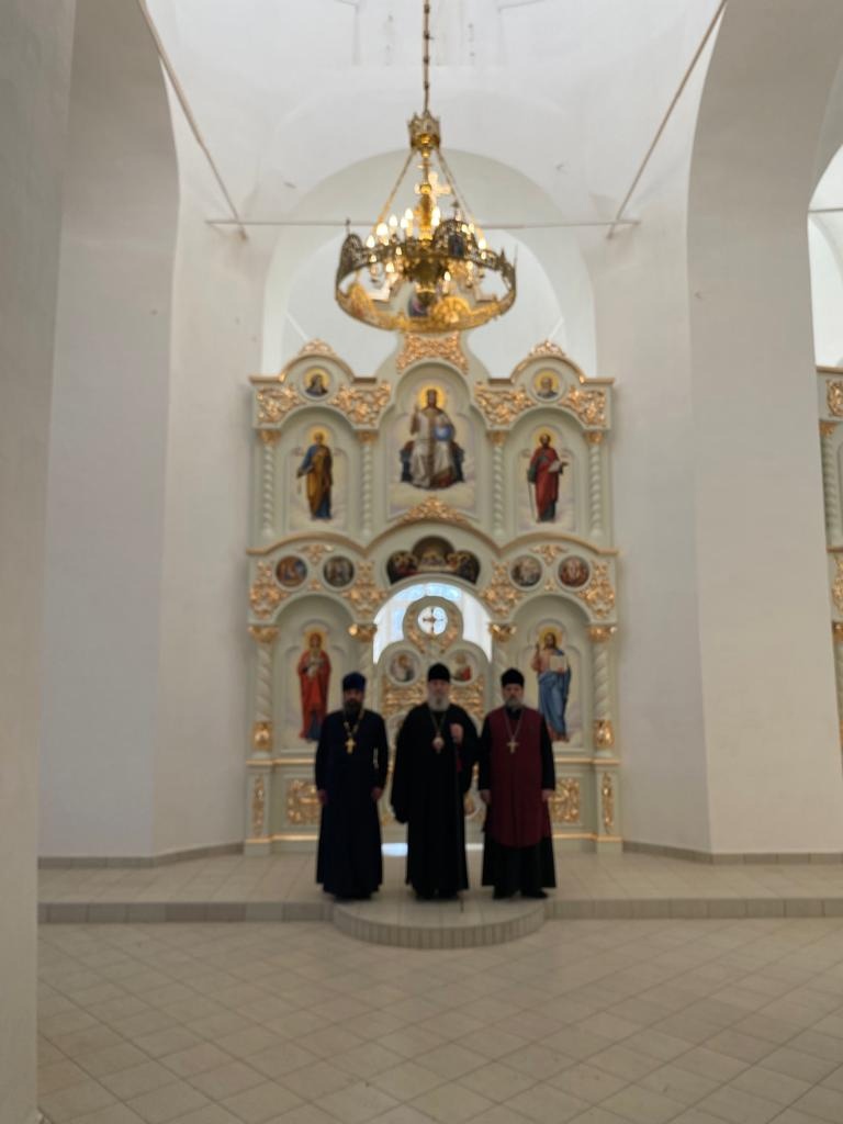 Во время визита владыка Сергий осмотрел отреставрированный храм Архангела Михаила, новоустроенный центральный иконостас и определили время Великого освящения храма.