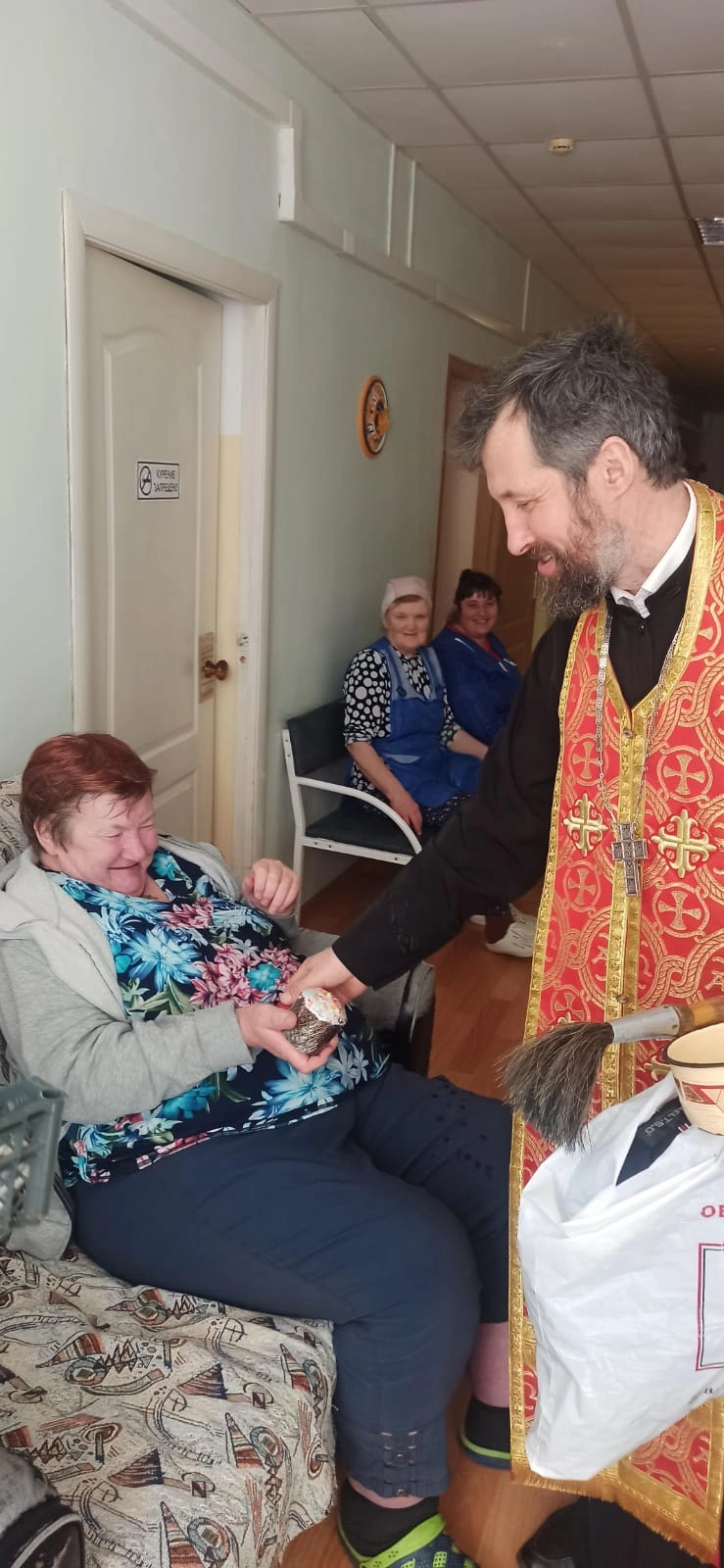 Посещение Настоятелем Всходского Дома-интерната в праздник Светлой Пасхи стало уже многолетней доброй традицией. Такие визиты позволяют зажечь пасхальной радостью сердца тех, кто в силу возраста или болезни не может посетить храм.