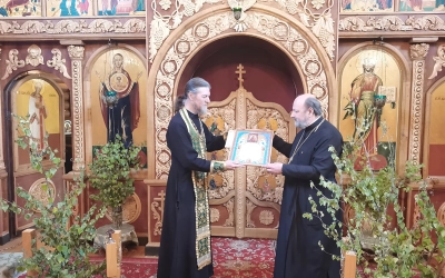 Секретарь епархиального управления протоиерей Олег Переверзев по поручению епископа Вяземского и Гагаринского Сергия вручил отцу Владимиру Архиерейскую грамоту.