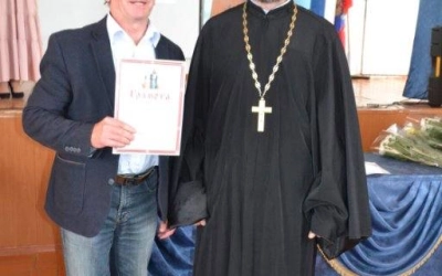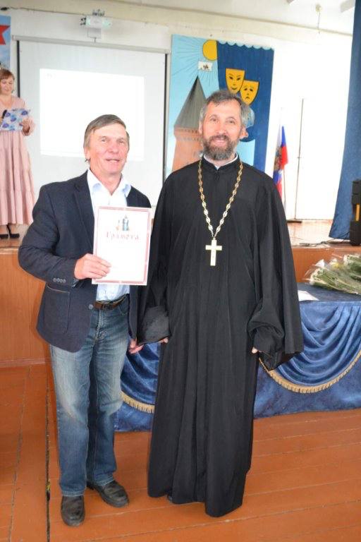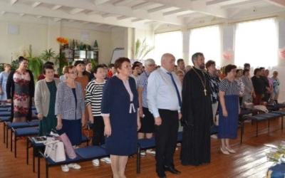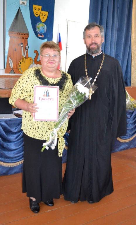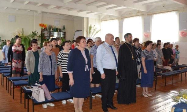 С поздравительным словом к педагогической общественности обратился протоиерей Валентин Зиньков. В своём выступлении он остановился на сотрудничестве Церкви и школы по духовно-нравственному воспитанию подрастающего поколения, проведении классных часов, уроков духовности и мужества. Настоятель передал благословение от имени правящего Владыки епископа Вяземского и Гагаринского Сергия и пожелал помощи Божией учителям в их нелёгком, но очень значимом для общества труде.