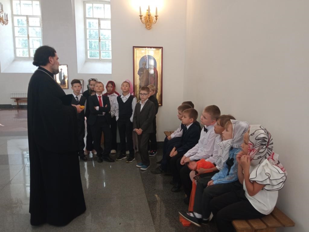 Настоятель Благовещенского собора игумен Александр Kарпиков обратился к школьникам с пастырским словом. Батюшка пожелал всем успехов в учёбе и призвал на ребят, воспитателей и учителей Божие благословение.