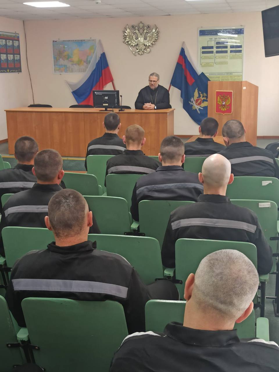 В актовом зале учреждения состоялись две встречи: сначала священник провел беседу с спецконтингентом, осужденными отряда хозобслуги, затем с работниками учреждения.
