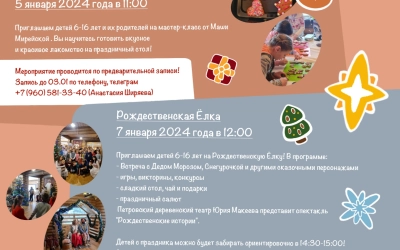 5 января в 11:00 состоится мастер-класс "Рождественский пряник", где дети смогут научиться готовить вкусное и красивое лакомство на праздничный стол. Возраст: 6-16 лет. Занятие проведет Мария Мирейская. Мероприятие проводится по предварительной записи! Запись до 03.01 по телефону, телеграм: +7 (960) 581-33-40 (Анастасия Ширяева)