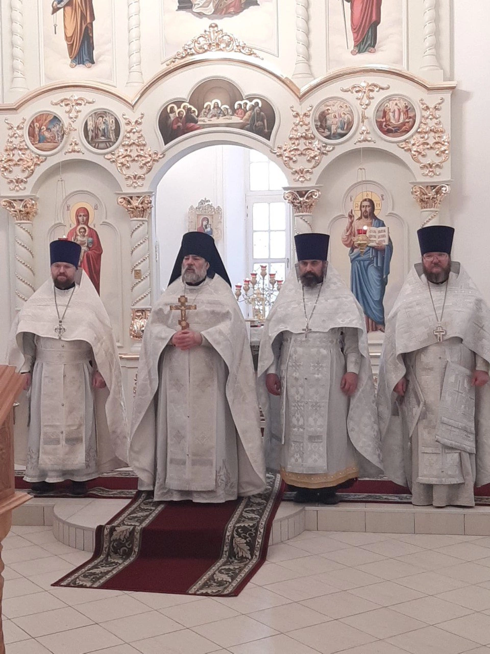 Богослужение возглавил благочинный Гагаринского церковного округа игумен Александр (Карпиков). Священнику сослужили: настоятель храма в честь Архангела Михаила иерей Ростислав Суконченко, настоятель храма в честь иконы Божией Матери "Одигитрия" д.Темкино иерей Сергий Морозов, настоятель храма в честь иконы Божией Матери "Владимирская" иерей Сергий Первушин.