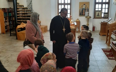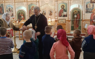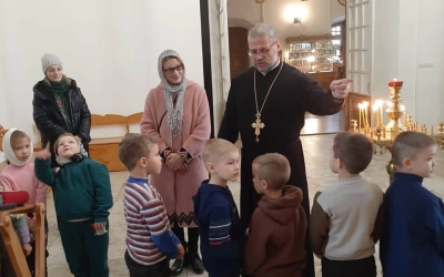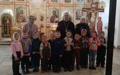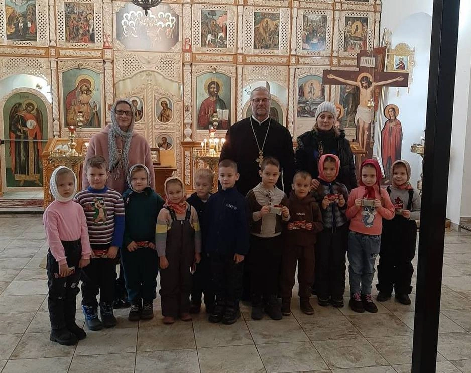 Священник рассказал детям об устройстве храма, церковных облачениях и иконах. Дети поставили свечи перед иконами. В завершении встречи всем были розданы подарки.