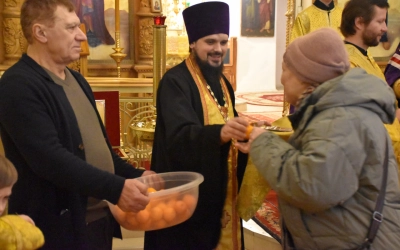 Подходя ко Кресту, каждый участник богослужения был окроплен Святой водой и получил освященные мандарины.