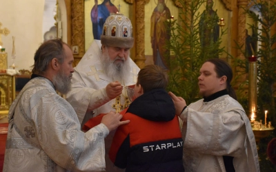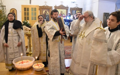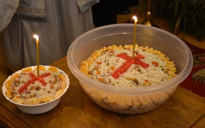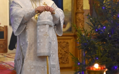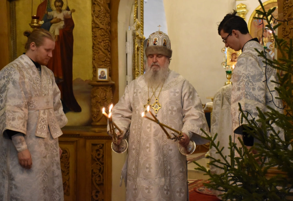 После Божественной литургии архипастырь в сослужении духовенства совершил Великую вечерню. В завершение богослужения перед рождественской свечой, знаменующей Вифлеемскую звезду, были пропеты тропарь и кондак праздника Рождества Христова, совершено освящение сочива (кутии).