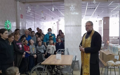 Поздравление с Рождеством Христовым началось с праздничного молебна, после которого отец благочинный поздравил всех детей и воспитателей с праздником, а также вручил сладкие подарки и хлебо-булочную продукцию Епархиальной пекарни.