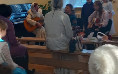 Детско-Юношеский хор Воскресной школы "Радуга" под руководством Ирины Гульевой и аккомпаниатором Оксаны Ермолаевой, клуб любителей песни ДДТ под руководством Елизаветы Красниковой, ученики ДШИ по классу баяна учителя и директора Усубовой О. в домашней обстановке порадовали песнями и стихами, исполнением живой музыки на баяне, фортепиано и скрипке.