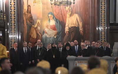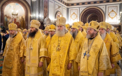 Святейшему Патриарху сослужили сонм архиереев Русской Православной Церкви, в том числе епископ Вяземский и Гагаринский Сергий.