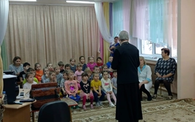В дошкольном учреждении отец Сергий побеседовал с детьми, рассказав им о православных праздниках и церковных Таинствах. Также священнослужитель ответил на вопросы педагогов.