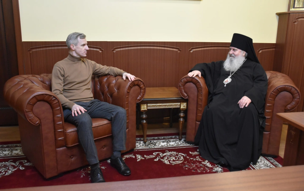 Затем гости соборной горы проследовали в здание Вяземского епархиального управления, где состоялась рабочая встреча епископа Вяземского и Гагаринского Сергия с Губернатором Смоленской области Василием Николаевичем Анохиным.