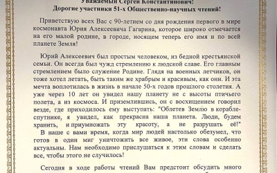 Сегодня в ходе работы чтений Вам предстоит обсудить много интересных тем, поделиться своими исследованиями и наблюдениями в области космической науки, истории России, сторонах жизни нашего национального героя - Ю.А.Гагарина. Желаю вам Божией помощи в работе чтений! Желаю любви к тому делу, которое вы выбрали и которое совершаете на благо нашего дорогого Отечества!»
