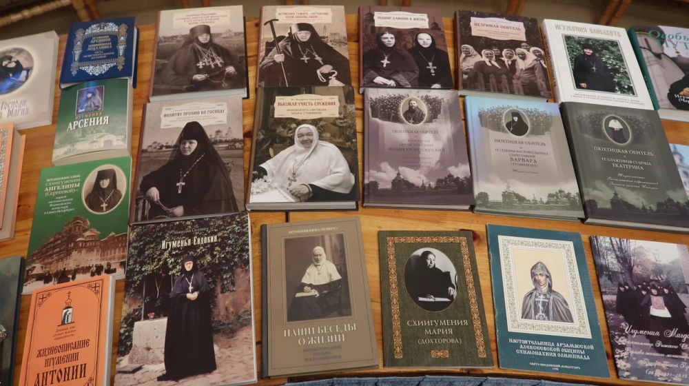 Экспозиция заканчивается книгами об известных подвижницах благочестия, инокинях, монахинях и схимонахинях: Дивеевских, Пюхтицких, Шамординских, Московских, Кавказских; Георгии (Каледа Л.В.), Сепфоре (Шнякиной), Ольге (Ложкиной)…