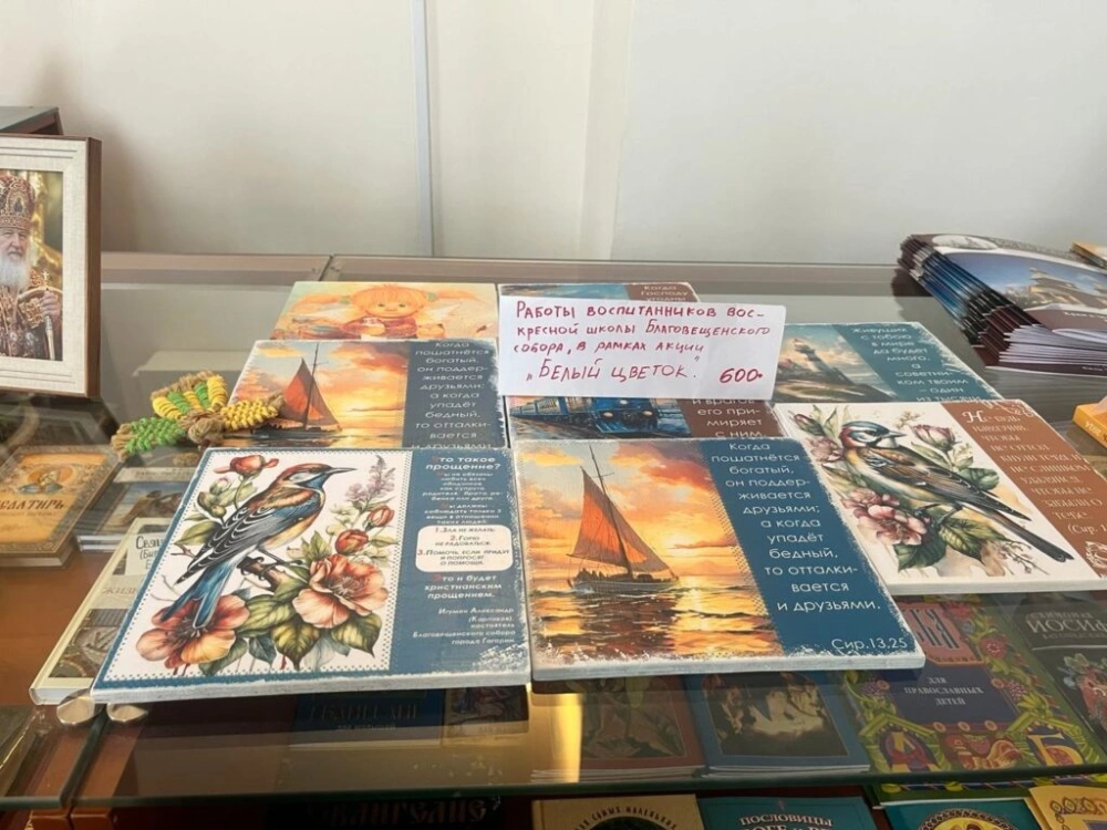 В рамках Дня православной книги и благотворительной акции «Белый цветок» мальчики и девочки изготовили творческие работы и фанерные панно-скрижали в технике декупаж со знаменитыми цитатами из Библии. Данные работы представлены в церковной лавке Благовещенского собора города Гагарин и пойдут в помощь на очередную реабилитацию маленькому Матвею.