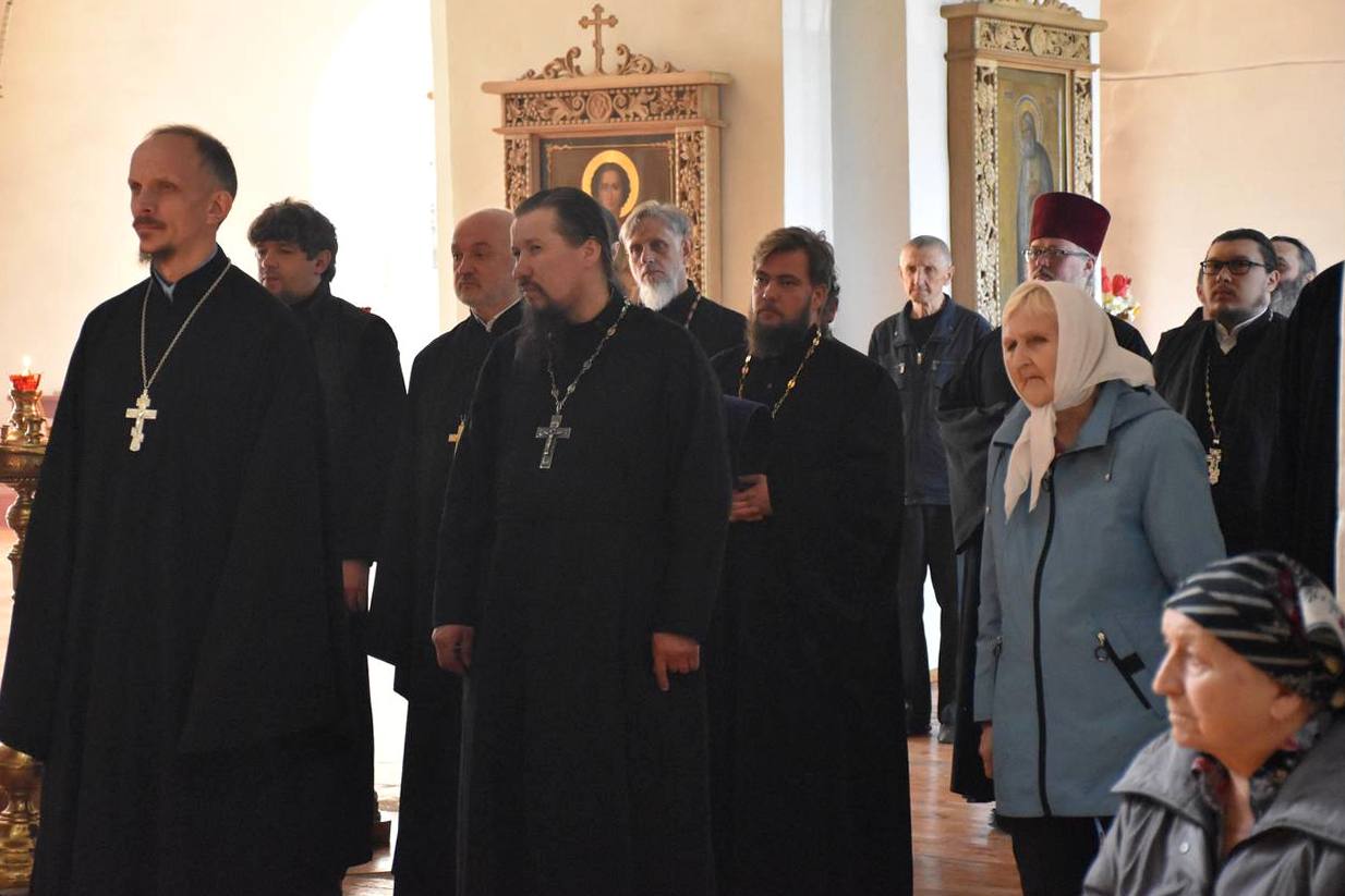 Его Преосвященству сослужили благочинный Сычевского округа, духовник Вяземской епархии митрофорный протоиерей Анатолий Чайкин, секретарь Вяземского епархиального управления протоиерей Олег Переверзев, благочинный Угранского округа, настоятель Свято-Троицкого кафедрального собора иерей Александр Курмелёв, благочинный Гагаринского округа игумен Александр (Карпиков), благочинный Вяземского городского округа протоиерей Валерий Калинин, благочинный Сафоновского округа иерей Сергий Чайкин, сонм духовенства Вяземской епархии.