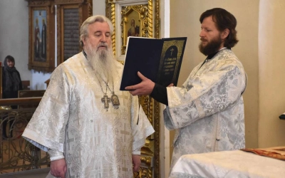 Его Преосвященству сослужили благочинный Угранского округа, настоятель Свято-Троицкого кафедрального собора иерей Александр Курмелёв и клирики собора: иеромонах Симеон (Берёзкин) и иеромонах Дамиан (Попков).