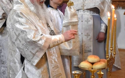 По заамвонной молитве епископ Сергий совершил освящение хлеба и вина. Затем Преосвященнейший Владыка обратился к молящимся с архипастырским словом, а также прочитал молитвы на освящение пасхальной трапезы и окропил святой водой куличи, крашеные яйца и пасхи, принесенные вязьмичами в этот день.