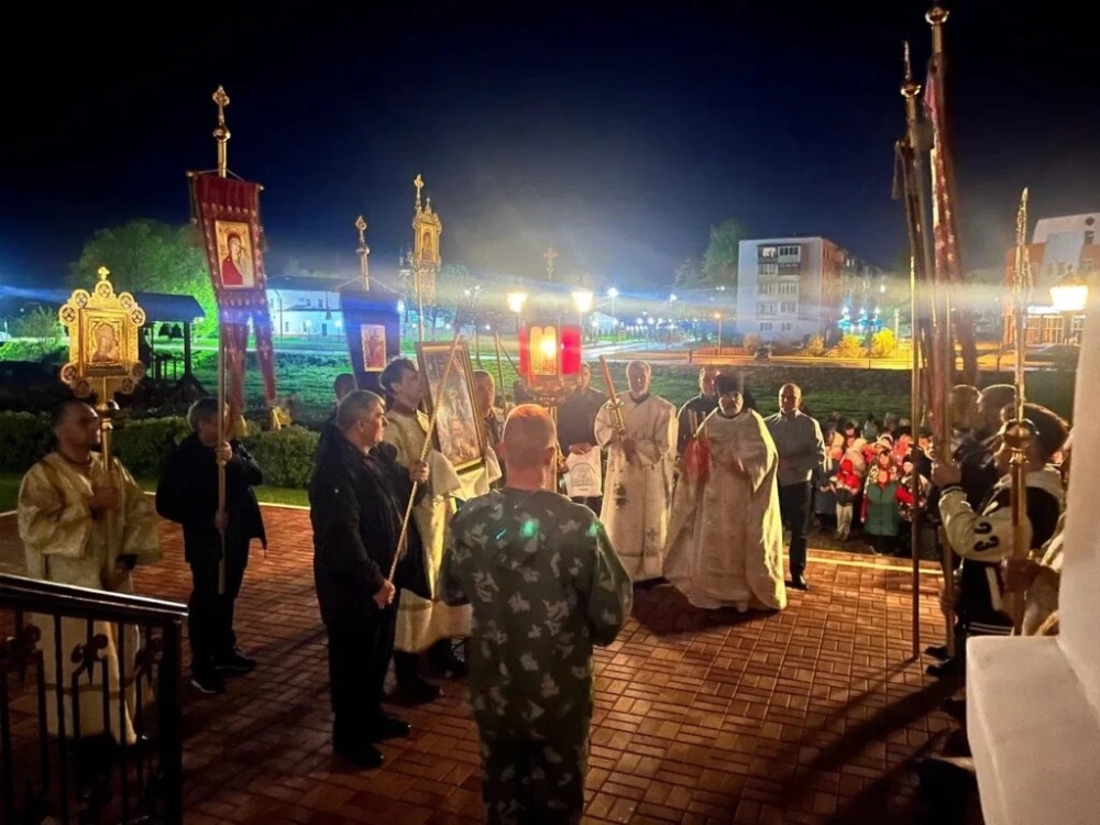 В полночь, под пение стихиры «Воскресение Твое, Христе Спасе», началось шествие крестного хода, которое символизирует шествие Жен Мироносиц ко гробу Спасителя. Крестный ход остановился у входа в храм, тем самым было положено начало пасхальной заутрене, здесь впервые прозвучал тропарь «Христос Воскресе из мертвых», а также возгласы «Христос Воскресе!» и «Воистину Воскресе!».