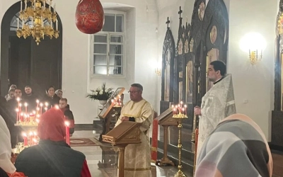 На Литургии было прочитано Пасхальное Евангелие от Иоанна (Ин. 1.1-17). Оно начинается величественным вступлением, в котором говорится о том, как Единородный Сын Божий открылся в мир. Слово, Которое было в начале у Бога и Само было Бог, и чрез Которое был сотворен мир, было жизнью и светом для людей и тьма не могла погасить этот свет.