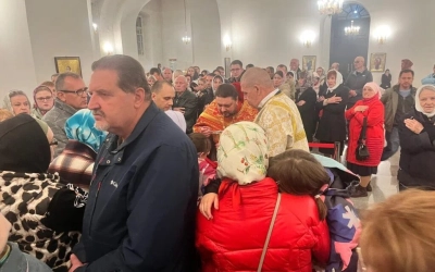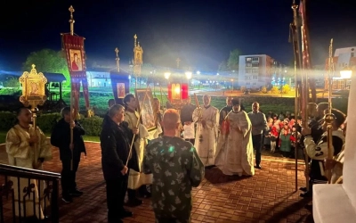 Игумен Александр отворил двери храма, все зашли внутрь, чтобы совершить праздничную службу.