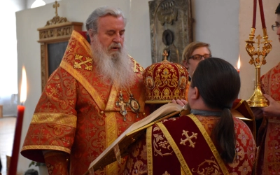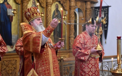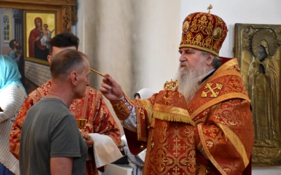 В продолжение Всенощного бдения Преосвященнейший Владыка Сергий совершил помазание освященным елеем и преподал архипастырское благословение духовенству и мирянам.