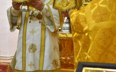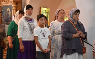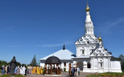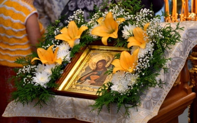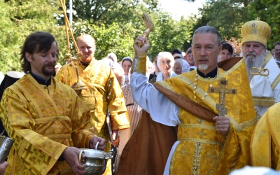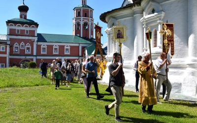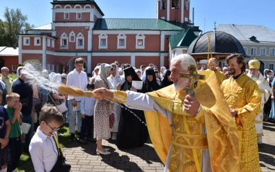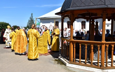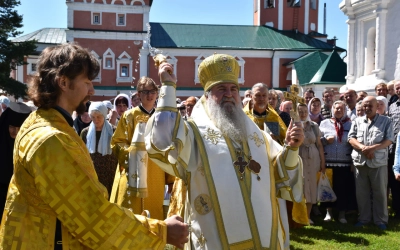 Затем Преосвященнейший Владыка вместе с духовенством и мирянами совершили Крестный ход вокруг Одигитриевского храма. Во время торжественного шествия был совершен водосвятный молебен.