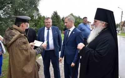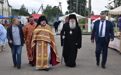 Затем Его Преосвященство обратился к молящимся с архипастырским словом, в котором сердечно поздравил всех жителей села Темкино с престольным праздником Ильинского храма и Днем села, а также отметил плодотворное соработничество между Вяземской епархией и Правительством Смоленской области, которое совершается сегодня на благо жителей Смоленской области.