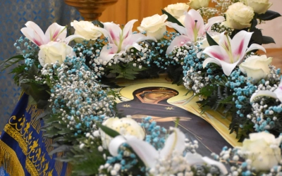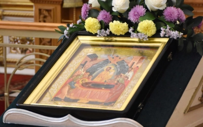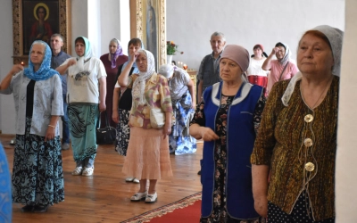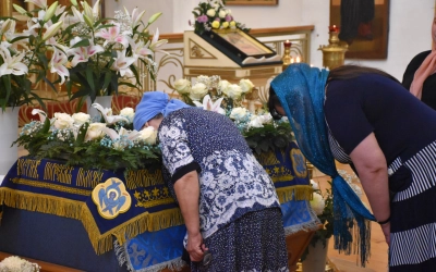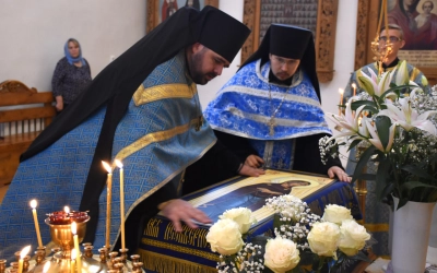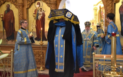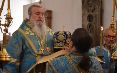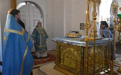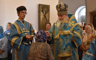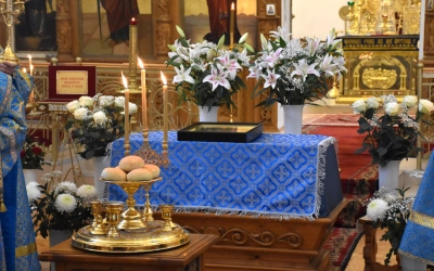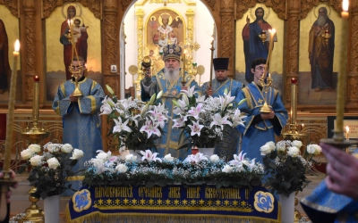 В начале полиелея из алтаря была изнесена и размещена в центре кафедрального собора Плащаница Пресвятой Владычицы нашей Богородицы и Приснодевы Марии для поклонения молящихся. В продолжении богослужения Преосвященнейший Владыка Сергий совершил помазание освященным елеем и преподал архипастырское благословение духовенству и мирянам.