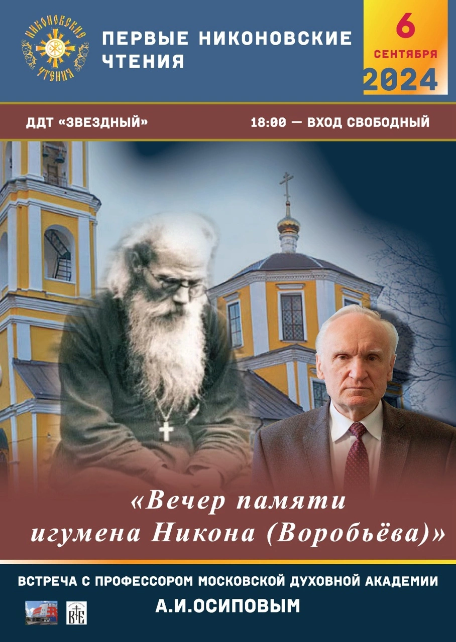 6 сентября 2024 года, в рамках Первых Никоновских чтений, в здании ЦДТ «Звездный» города Гагарин Смоленской области состоится встреча с профессором Московской Духовной Академии Алексеем Ильичом Осиповым. Тема: "Вечер памяти игумена Никона (Воробьева)".