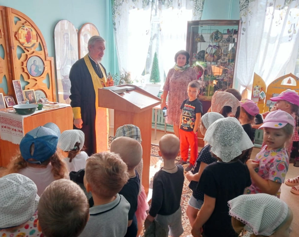Поздравить педагогов и детей с началом нового учебного года пришёл настоятель храма в честь иконы Божией Матери "Достойно есть" протоиерей Сергий Зеленков. Побеседовав с воспитанниками дошкольного учреждения, священник благословил их и окропил Святой водой.