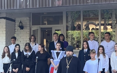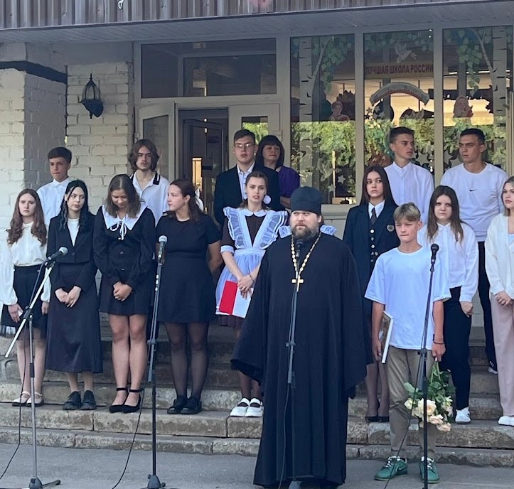 На линейке, посвященной Дню знаний, присутствовали почётные гости: директор АО «Мосводоканал» Трабуров В.В. и настоятель храма «Всех Скорбящих Радосте» села Карманово иеромонах Андрей (Дергачёв-Белошецкий).