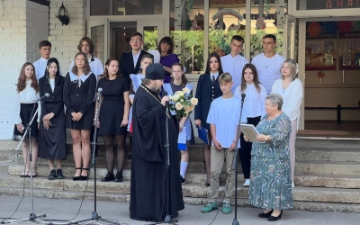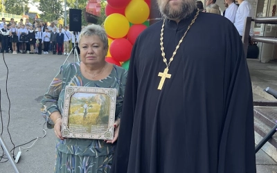 В День Знаний с напутственными словами выступили почетные гости. Отец Андрей также поздравил директора школы Иванову Т.И. с «платиновым» Юбилеем, подарив юбилярше символический подарок и букет благоухающих роз.
