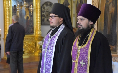 Его Преосвященству сослужили благочинный Угранского округа, настоятель Свято-Троицкого кафедрального собора иерей Александр Курмелёв и клирики собора: иеромонах Симеон (Берёзкин) и иеромонах Дамиан (Попков).