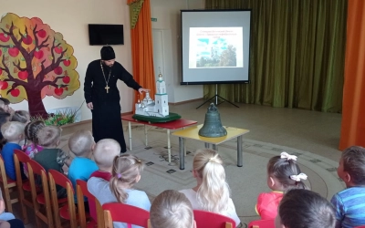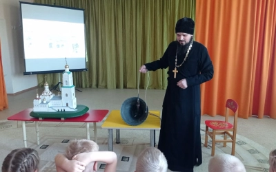 Преподаватель по духовно-нравственному воспитанию Галина Дмитриевна Гуторова рассказала ребятам о колокольном звоне и устройстве колокола. Батюшка представил вниманию ребят макет собора и колокольни.