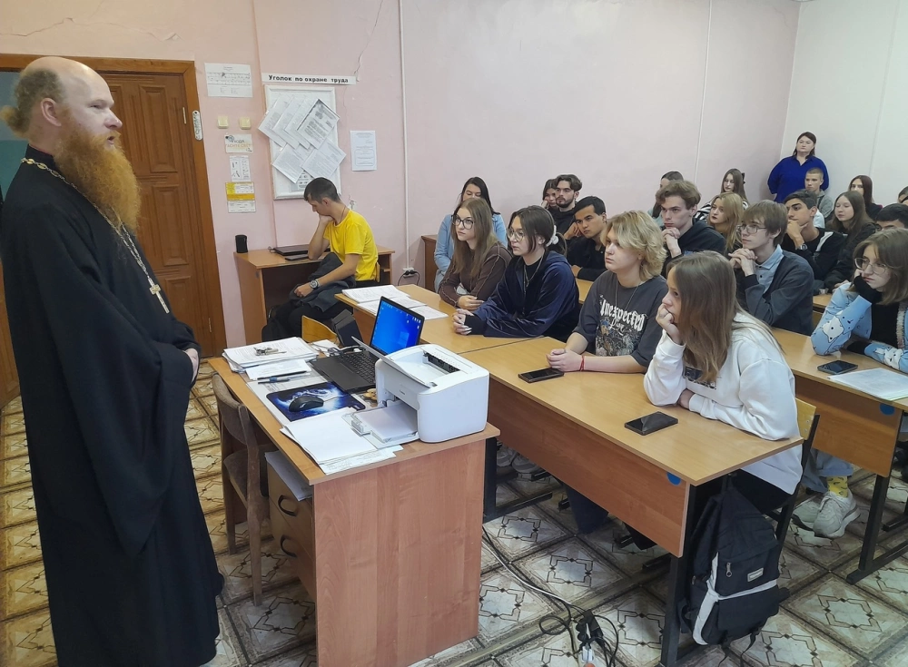 В этот же день отец благочинный провел классный час для учащихся СмолАПО. В диалоговой форме отец Сергий говорил с молодыми людьми об основах Православной веры. В частности, были подняты вопросы о Заповедях Божиих, грехе и покаянии, а также о взаимоотношениях между людьми. После беседы студенты смогли задать священнослужителю волнующие их вопросы.