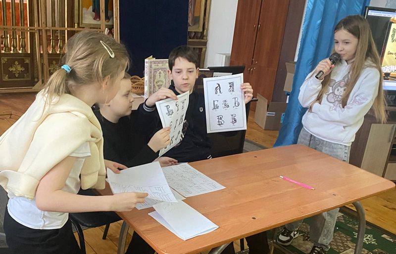 Ведущая интервью Воронцова София помогала в раскрытии темы и задавала непростые, а порой, каверзные вопросы из зала. Воспитанники младшей группы познакомились с историей появления книги и попробовали изобразить церковно-славянские буквы с помощью пера на пластилиновой табличке.